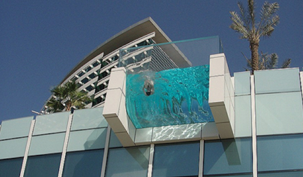 •E quando a piscina de vidro está sobre um grande vão, com o fundo transparente, o resultado é bem inusitado para quem está dentro da piscina, pois ela tem a sensação de estar voando.
